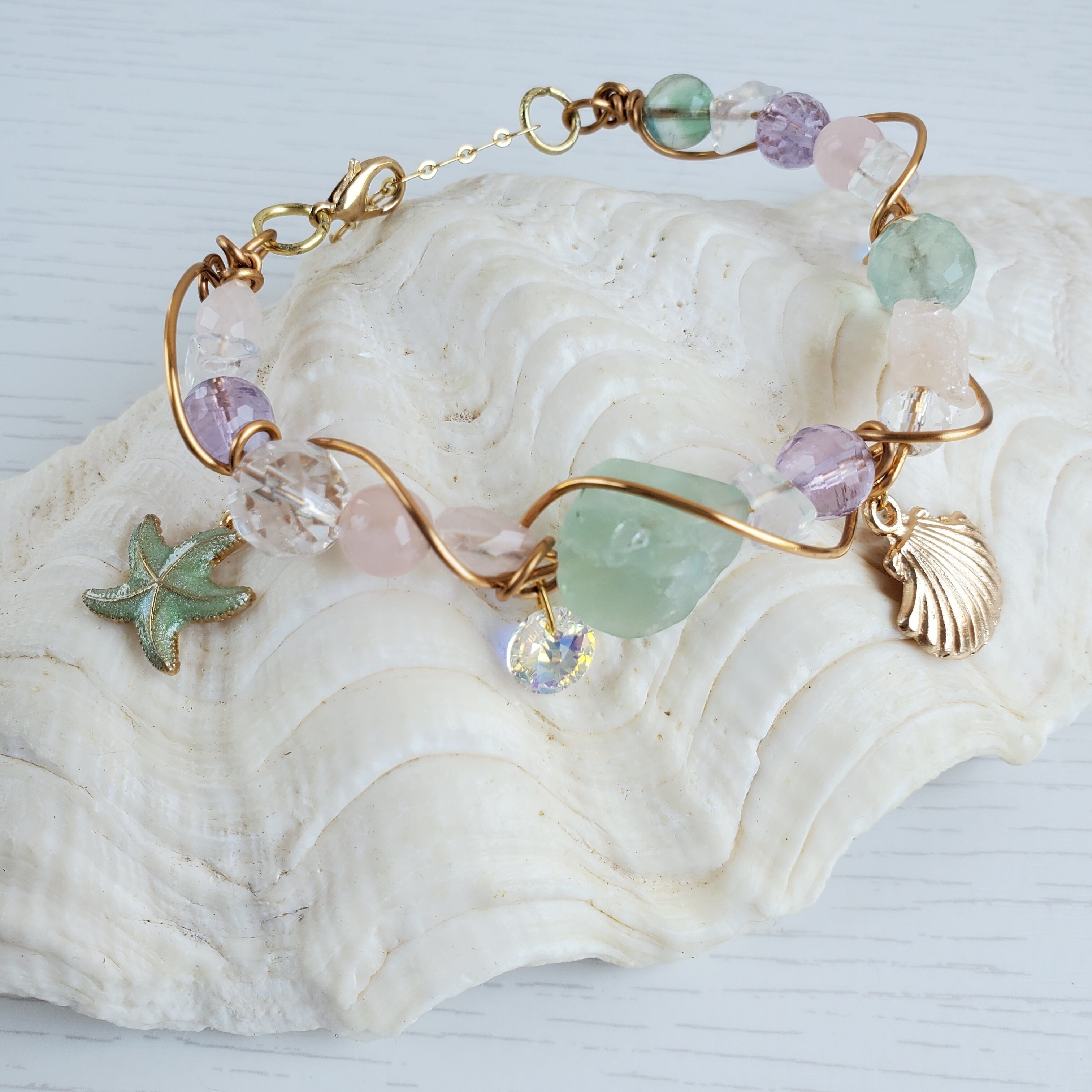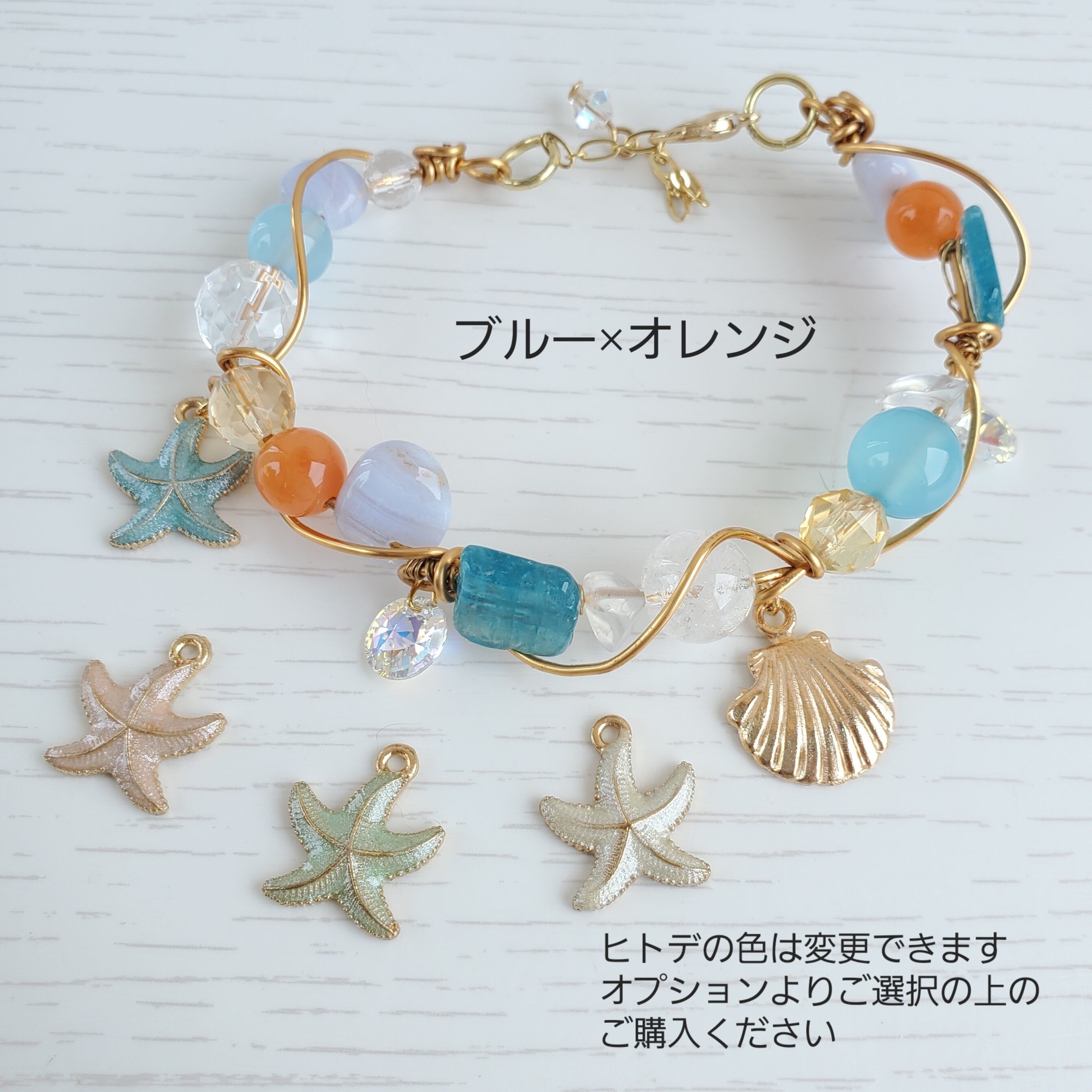 【個数限定販売】天然石 サマーブレス ヒトデ 貝殻 スワロフスキー ワイヤーアートジュエリー
