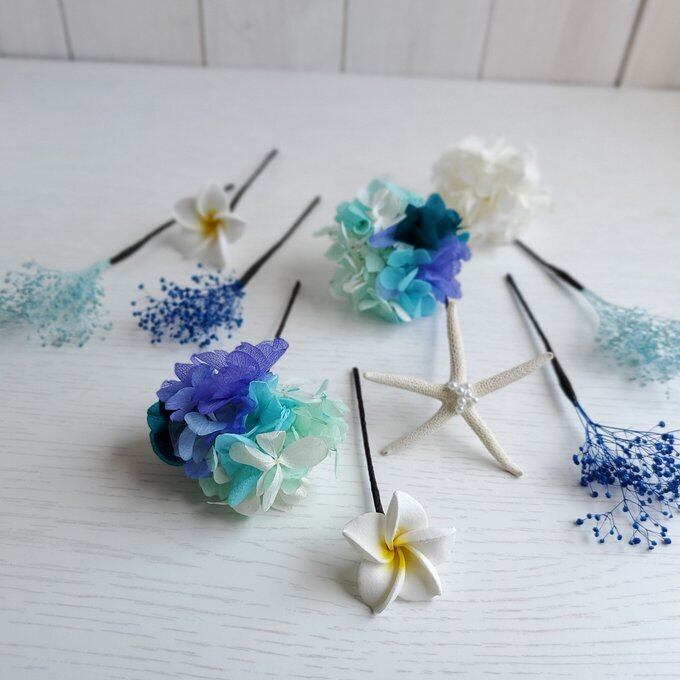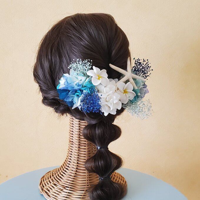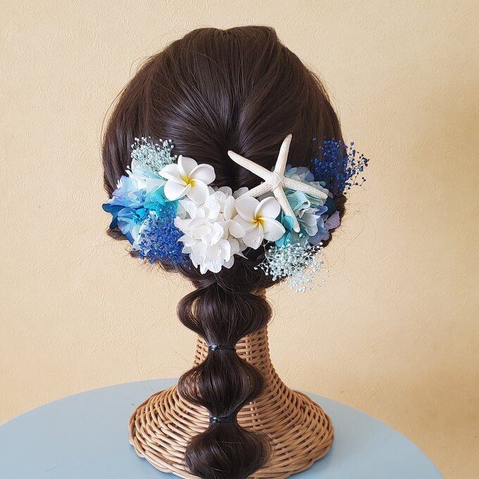 ブルーグリーン プルメリア スターフィッシュ リゾート髪飾り 結婚式 ドライフラワー プリザーブドフラワー